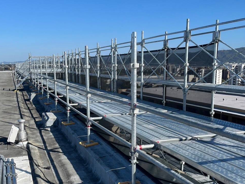 当社は、大規模建造物工事向けの枠組み足場や次世代足場、中低層建物用のクサビ式足場など様々な足場工事に対応しています。